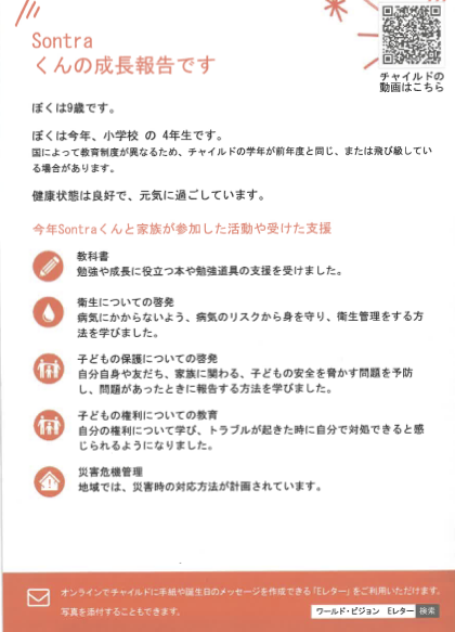 また、地域では衛生や病気予防の教育が進められており、Sontraくん自身も「正しい手洗い」や「安全な飲み水の大切さ」を学んでいます。
