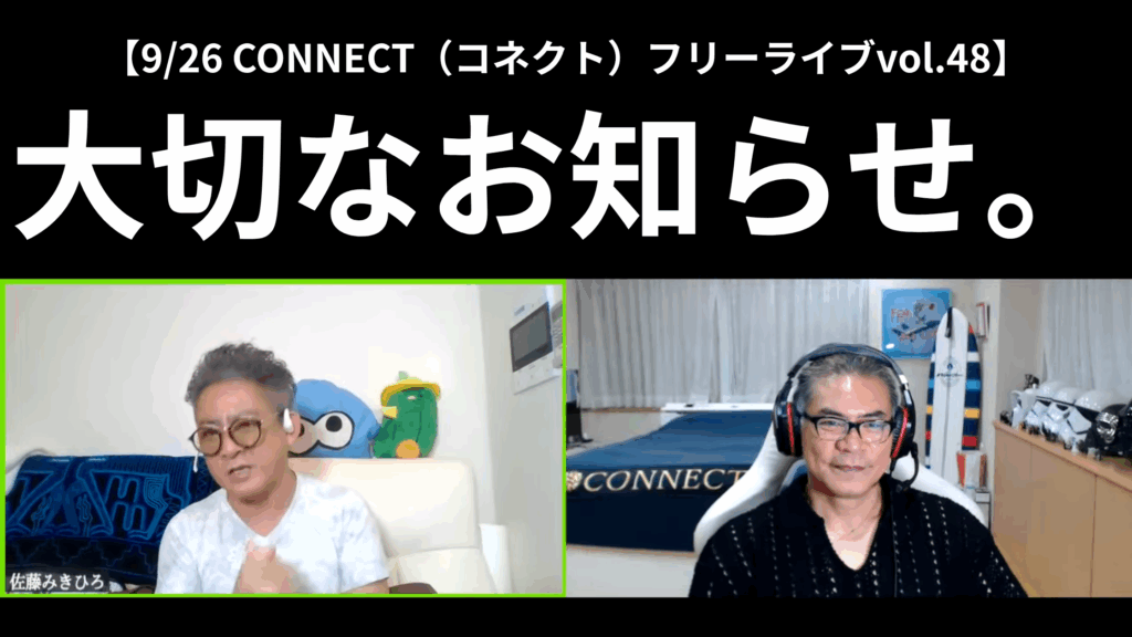 こんにちは!運営スタッフです!9/26に48回目のフリーライブが開催されました!今回は大切なお知らせになりますので、最後まで読んでいただけると幸いです。 毎週木曜の夜に開催されてきた「CONNECTフリーライブ」。ロミオさんとみきひろさんによる対談形... -